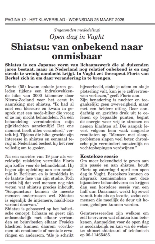 Iedereen die nog nooit shiatsu heeft mogen ervaren en serieuze interesse heeft, nodig ik uit voor een gratis shiatsu moment tijdens mijn open dag. Iedereen, jong en oud, geef ik kosteloos een behandeling van 15-20 minuten ter waarde van zo’n €40. Tijdens die ontspannende behandeling voel je wat ik doe en daarna voel je wat het met jou heeft gedaan.
